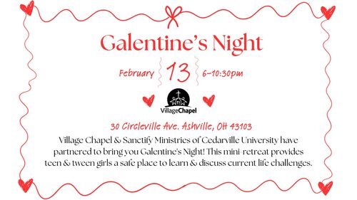 Sunday, January 25th- Guys & Girls Night - Guys will be meet Village Chapel & Girls will meet at Betsy Acord's house (315 Gary St. Ashville, OH 43103) 6pm-8pm
